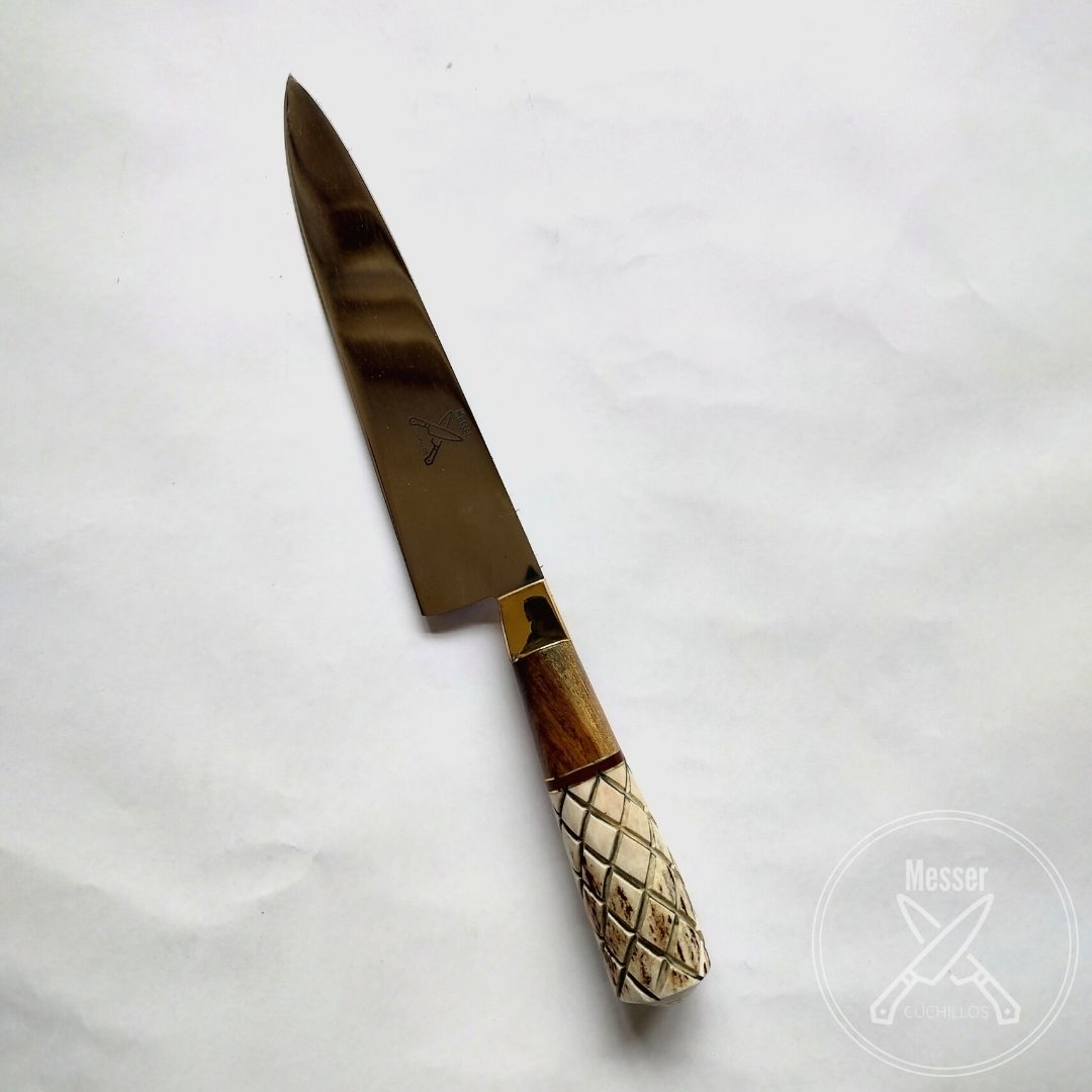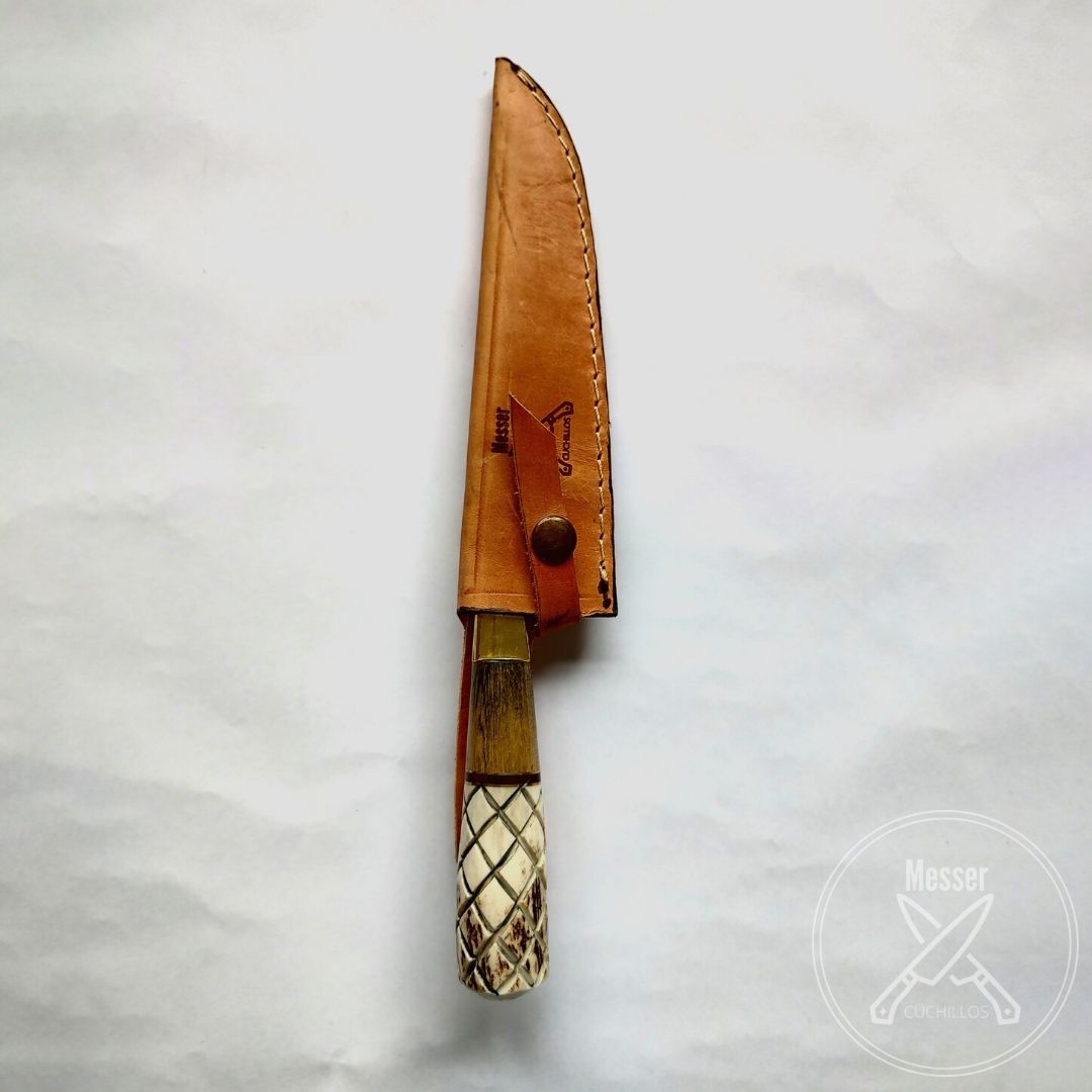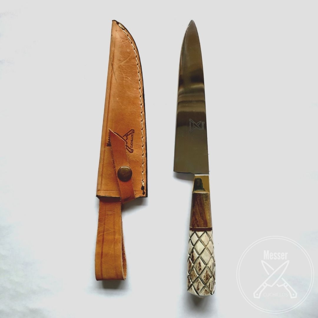 Cuchillo combinado de madera guayubirá y asta de ciervo con detalles en bronce